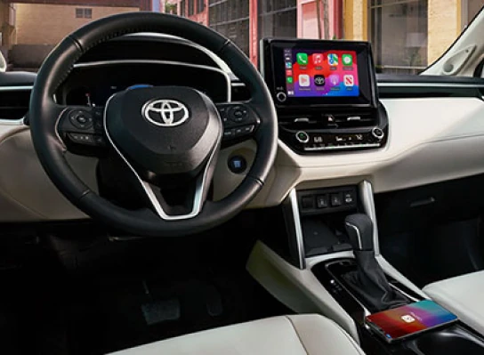 با نگاهی به فضای کابین تویوتا کرولا کراس می توان به خوبی دریافت که با خودرویی اقتصادی همراه هستیم. چرا که زبان طراحی به کار رفته در این خودرو مشابه با سایر محصولات اقتصادی این برند ژاپنی است و به خوبی با حفظ المان های مشترک تویوتا، ذات اقتصادی خود را خفظ کرده است. طراحی داشبورد به صورت یکپارچه و ساده دقیقا مشابه با محصولات میان رده تویوتا از جمله کرولا و لوین است. خط افقی سراسری که به طرفین داشبورد و کابین امتداد یافته، با دریچه های افقی تکمیل می شود. همچنین یک نمایشگر لمسی 8 اینچی در مرکز داشبورد تعبیه شده که در قسمت زیرین آن، تریم مشکی پیانویی محلی برای قرار گرفتن کنترلرهای سیستم تهویه است. بخش بالای داشبورد در مدلهای مختلف، از خاکستری تیره تشکیل شده اما قسمت میانی به رنگ صندلیها، سیاه، کرم روشن یا حتی قرمز است.